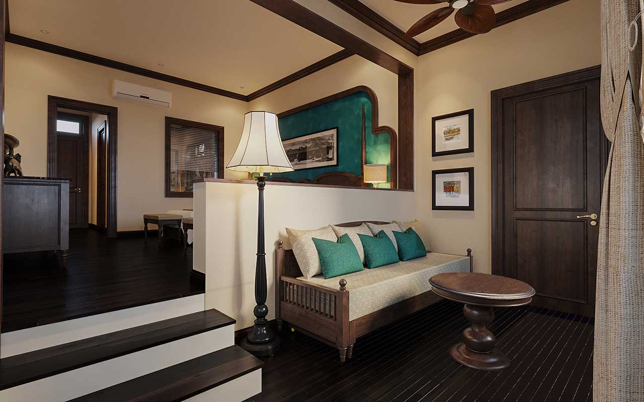 View details..The elegant 1930s Indochina heritage-style Anmira Junior Suite includes a spacious bedroom area combined with a delightful living room to give a feeling of home as well as luxury. Soak up the tranquility of your natural surroundings with an indoor rain shower.