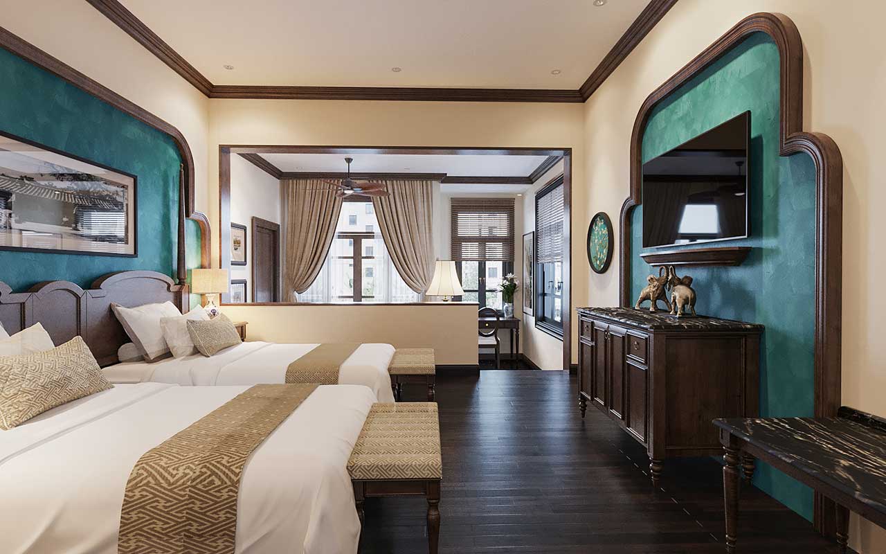 View details..Designed in the traditional Indochina heritage style our family deluxe rooms feature beautiful hardwood floors and original antique furnishings. Rooms include 2 bathrooms and a balcony with garden views to enjoy the peaceful surroundings. Interconnecting rooms, with twin and double beds, give that extra space to ensure a good night's sleep for everyone.