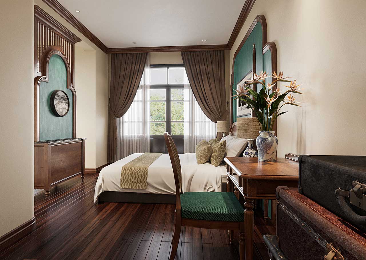View details..The elegant 1930s Indochina heritage-style Anmira Junior Suite includes a spacious bedroom area combined with a delightful living room to give a feeling of home as well as luxury. Soak up the tranquility of your natural surroundings with an indoor rain shower.